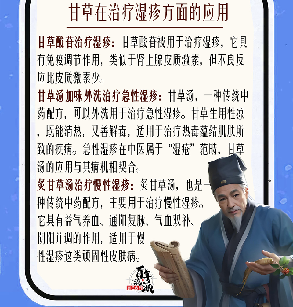 甘草酸苷治疗湿疹:甘草酸苷被用于治疗湿疹,它具有免疫调节作用,类似于肾上腺皮质激素,但不良反应比皮质激素少。